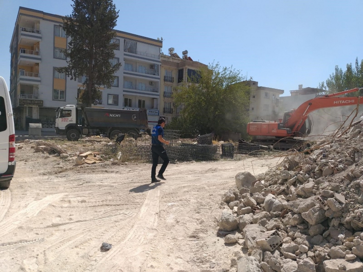 Adıyaman Belediyesi Zabıta Müdürlüğü ekipleri, kent genelinde yürütülen yıkım, yerinde dönüşüm ve inşaat çalışmaları sırasında çevre ve halk sağlığını tehd