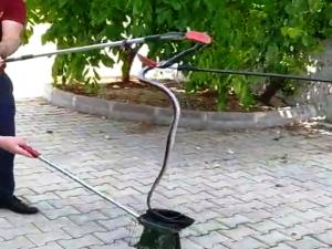 Adıyamanda bir ağaçta görülen 1,5 metre uzunluğundaki yılan itfaiye ekipleri yakaladı.