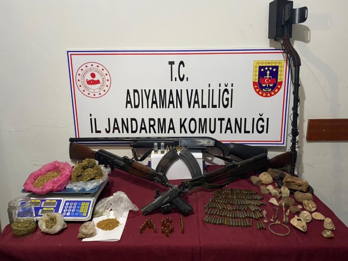 Adıyaman´da jandarma ekipleri, uyuşturucu tacirlerine yönelik düzenlediği operasyonda uyuşturucunun yanı sıra, çok sayıda tarihi eser ve silah ele geçirdi.