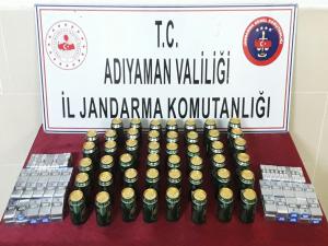 Adıyaman-Şanlıurfa karayolunun 30'ncu kilometresinde oluşturulan uygulama noktasında plakası açıklanmayan otomobilde yapılan aramada 47 kutu kaçak içki ile 70 paket kaçak sigara ele geçirildi.