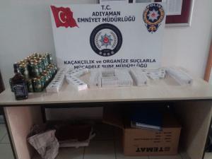 İl Emniyet Müdürlüğü Kaçakçılık ve Organize Suçlarla Mücadele Şube Müdürlüğü ekipleri tarafından Adıyaman-Şanlıurfa karayolunun 25'nci kilometresinde oluşturdukları uygulama noktasında durumundan şüphelenerek durdurulan otomobilde yapılan aramada 199 paket kaçak sigara ile 48 kaçak içki ele geçirildi.
