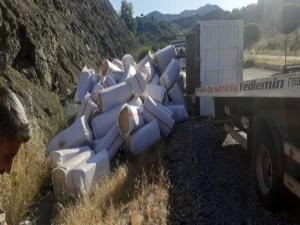 Kamyonda bulunan saman çuvalları yola dağıldı. Yaşanan kazada sürücü yara almadan kurtuldu.