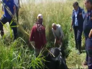 Adıyaman'da, tarlada sulama kanalına düşen inek itfaiye ve AFAD ekiplerince kurtarıldı.