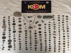 Operasyonda evde yapılan aramada 181 sikke ve 28 tarihi eser objeleri ele geçirildi. Ele geçirilen tarihi eserlere el konulurken A.T., ise gözaltına alındı. Gözaltına alınan A.T., sorgulanmak üzere emniyete götürüldü.