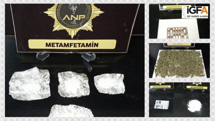 Narkotik Suçlarla Mücadele Şube Müdürlüğü ekipleri kent merkezinde yaptıkları denetimlerde T.T., isimli şahıstan 3 fişek halinde 1.85 gram metamfetamin, N.Y., M.D., isimli şahıslardan 2.80 gram metamfetamin, Ö.K., isimli şahıstan 14 adet sentetik ecza hap, N.G.D., G.K., isimli şahıslardan 6 gram esrar, 0.55 gram metamfetamin, 1 adet ruhsatsız tabanca, M.T., isimli şahıslardan 9.80 gram metamfetamin, 5 adet sentetik ecza hap, A.G., SK., isimli şahıslardan 4 parça halinde 9.65 gram metamfetamin, M.Ü.S., E.C.A., isimli şahıslardan 3 paket halinde 58.40 gram esrar ve H.D., isimli şahıstan ise 47 gram metamfetamin maddesi ele geçirildi. Ele geçirilen uyuşturucu maddelerine el konulurken 12 şahıs ise gözaltına alındı. Öte yandan Adıyaman´daki torbacılara dağıtmak üzere Gaziantep´ten metamfetamin maddesi getirdiği esnada yakalanan H.D., isimli şahıs, emniyette tamamlanan işlemlerinin ardından Adıyaman Adliyesine sevk edildi.