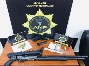 Adıyamanda bir eve düzenlenen operasyonda uyuşturucu madde ile ruhsatsız silah ve tüfek ele geçirildi. Şüpheli 1 kişi gözaltına alındı.
