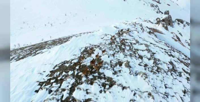 Koçali Köyü yakınlarında ve rakımı yüksek dağlık bölgelerde yaşayan yaban keçileri, yağan kar ile birlikte yiyecek bulmakta zorluk çekiyor. Yiyecek bulmak için sürüler halinde kar üzerinde ilerleyen yaban keçileri, drone ile havadan görüntülendi. Onlarca yaban keçisinin, 1 metreyi geçen kar kalınlığının olduğu yerlerden kayalık bölgelere giderek yiyecek aradığı görüldü.