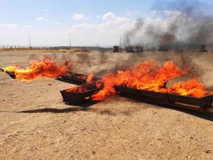 Devlet Hava Meydanları İşletmesi(DHMİ) tarafından, havaalanında senaryo gereği gerçekleşen tatbikatta düşen uçakta çıkan yangın hazırda bekletilen itfaiye ekipleri tarafından yangın söndürülürken çıkan yangında personellere yangın söndürme hakkında bilgi verildi.