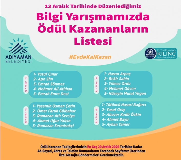 Korona virüs dolayısıyla sosyal etkinliklerini online olarak gerçekleştiren Adıyaman Belediyesinin hafta sonu düzenlediği bilgi yarışmasının kazananları belirlendi.