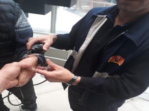 Engelli Mehmet T. özel güvenlik görevlilerden aldığı kelepçeyi ellerine taktı.^Özel güvenlik görevlileri kelepçeyi çıkartmak isterken anahtarının kırılması üzerine Mehmet T. güvenlikçiler ile birlikte Adıyaman Belediyesi itfaiye müdürlüğüne getirildi.