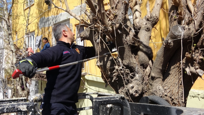 Adıyaman´da, yaklaşık 2 gündür bir ağacın üzerine çıkan ve yere inemeyerek aç ve susuz kalan kediyi itfaiye ekipleri kurtardı.