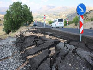 Meydana gelen yol çökmesi nedeniyle Adıyaman Karayolları ekipleri, sürücülerin kontrollü geçiş sağlaması için uyarı levhaları yerleştirdi.