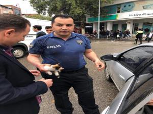 Adıyamanda Minibüsün tekerine sıkışan kediyi polis kurtardı.