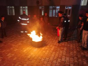 Tatbikatta öğrencilere yangının çıkış sebebi, yangına müdahale, yangın esnasında yapılması gerekenler, yangından kaçış yöntemleri, yangın merdiveninin kullanım şekli konularında teknik bilgiler verdi.