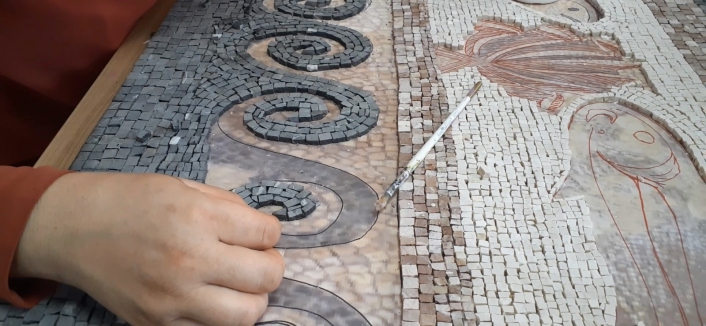 Samsat Halk Eğitim Merkezi Resim Öğretmeni Yeter Yıldız´ın koordinesinde yürütülen çalışmalarda görev alan kursiyer ve gönüllüler titizlik ve sabır gerektiren bir çalışma ile kopyaları çıkarılan figürlerin asıllarına çok yakın bir sonuç elde ediyor. Çizilen resimlerin üzerine taşlar yapıştırılarak, mozaikler oluşturuluyor.