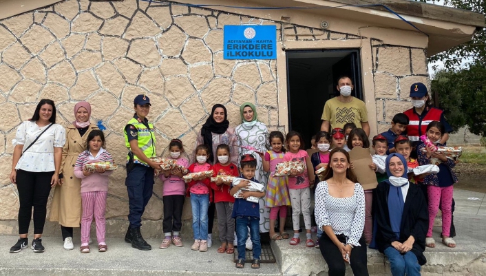 Adıyaman´ın Kahta ilçesinin Erikdere Köyü okulunda öğrencilerle bir araya gelen Adıyamanlı Şehit Jandarma Uzman Çavuş Ayhan Yanık´ın eşi Beyhan Yanık, Adıyamanlı Nazlıcan Uçar, Seval İlhan ve Nuray Şahin, kırtasiye ve oyuncak yardımında bulundu. Köy okulu öğrencileriyle bir araya gelen gençlere, Kahta ilçe Jandarma Komutanlığı ekipleri de eşlik etti.