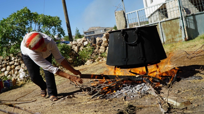 Adıyaman'ın Gölbaşı ilçesinde, bağ bozumunun sona ermesiyle birlikte evlerde üzüm pekmezi yapımı başladı.